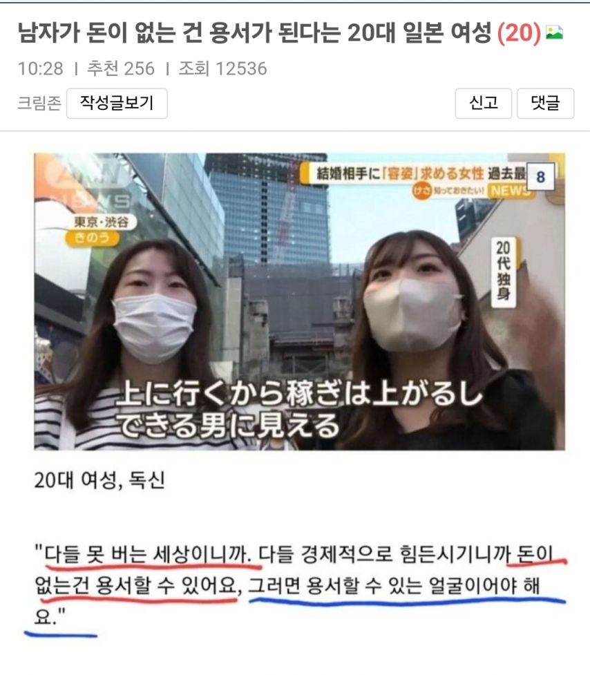 남자가 돈이 없는건 용서가 된다는 20대 일본 여성