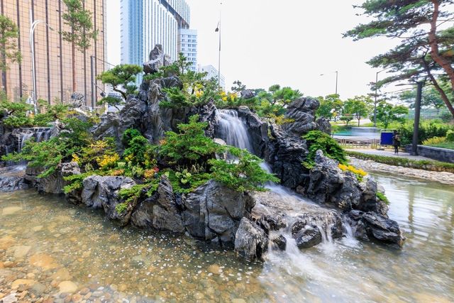 폭포는 정원을 포함해 240㎡ 규모이며 양방향에서 감상할 수 있도록 설계됐다. 여름철에는 도심 열섬 현상 완화에도 기여할 것으로 구는 기대했다.