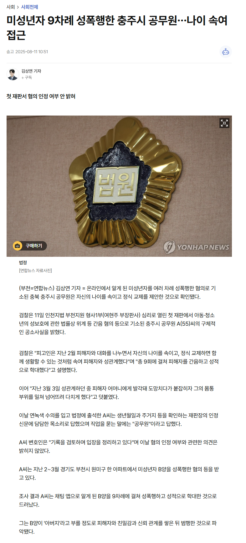 미성년자 9차례 성폭행한 충주시 공무원…나이 속여 접근