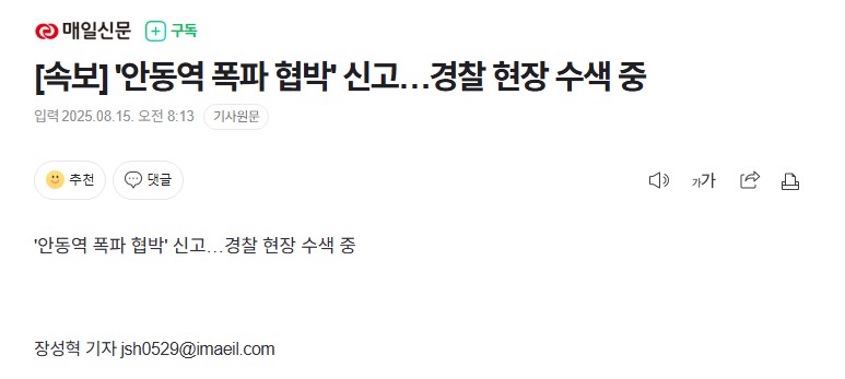 커뮤니티 인기글1[속보] 안동역 폭발물 테러 협박https://n.news.naver.com/mnews/article/088/0000964638?sid=102– 실시간 라이브 방송 링크 –이 약속의 만남을 실시간 라이브로 하고 있었음..라이브 보는데 경찰 분이 와서 100미터 이상 떨어지라 함또 어떤 쓰레기가 이런 짓을….