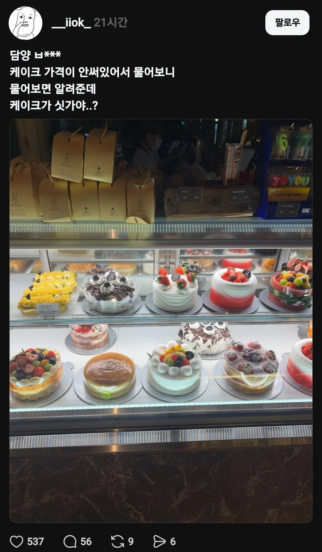 커뮤니티 인기글1케이크 가격을 물어봐야 알려주는 빵집상품 이름과 가격표시 안해두면, 식품 표시기준 위반이라고 합니다.점원과 기싸움 하지 마시고, 신고하세요~식품 표시 기준 위반 신고는 식품안전나라 소비자신고센터 또는 국번없이 1399다음 방문때에는 상품 명/가격표시 되어 있을거예요!